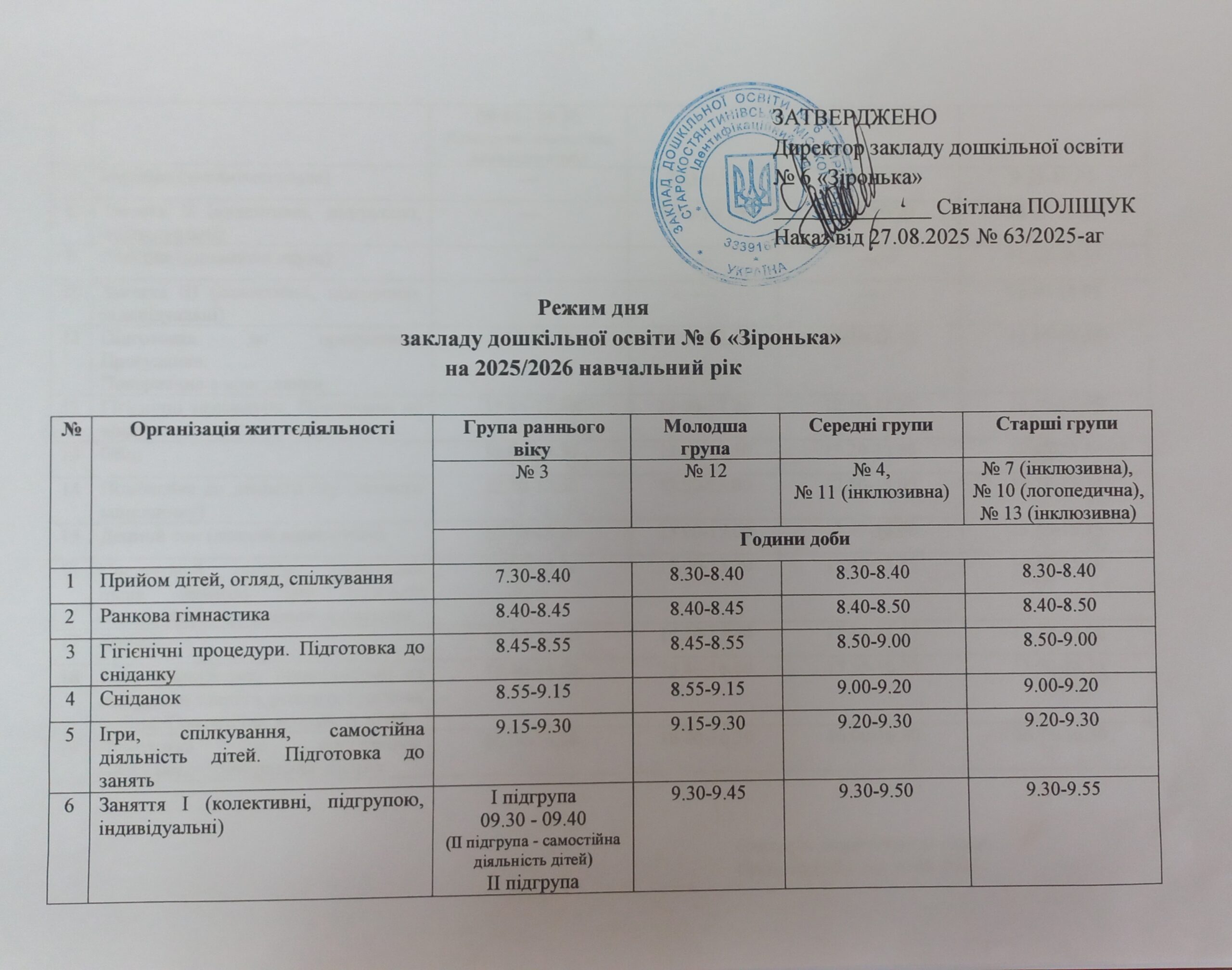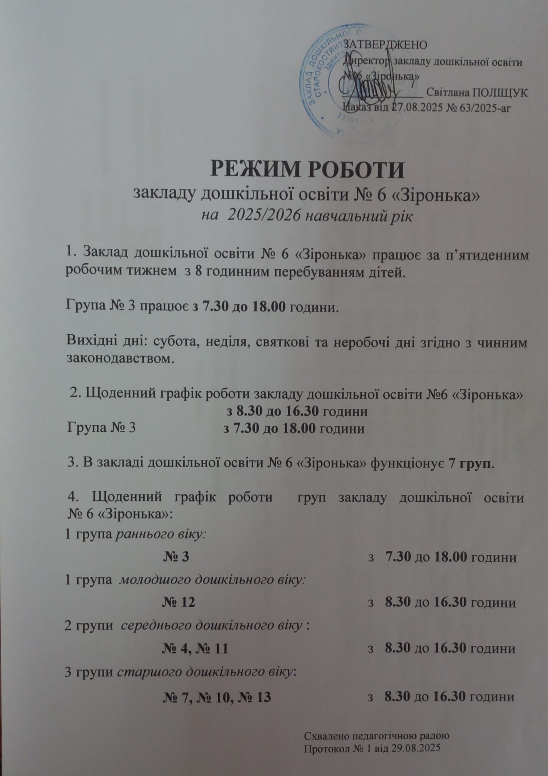 Режим роботи: 8:30 – 16:30, чергова група: 7:30 до 18:00 год.