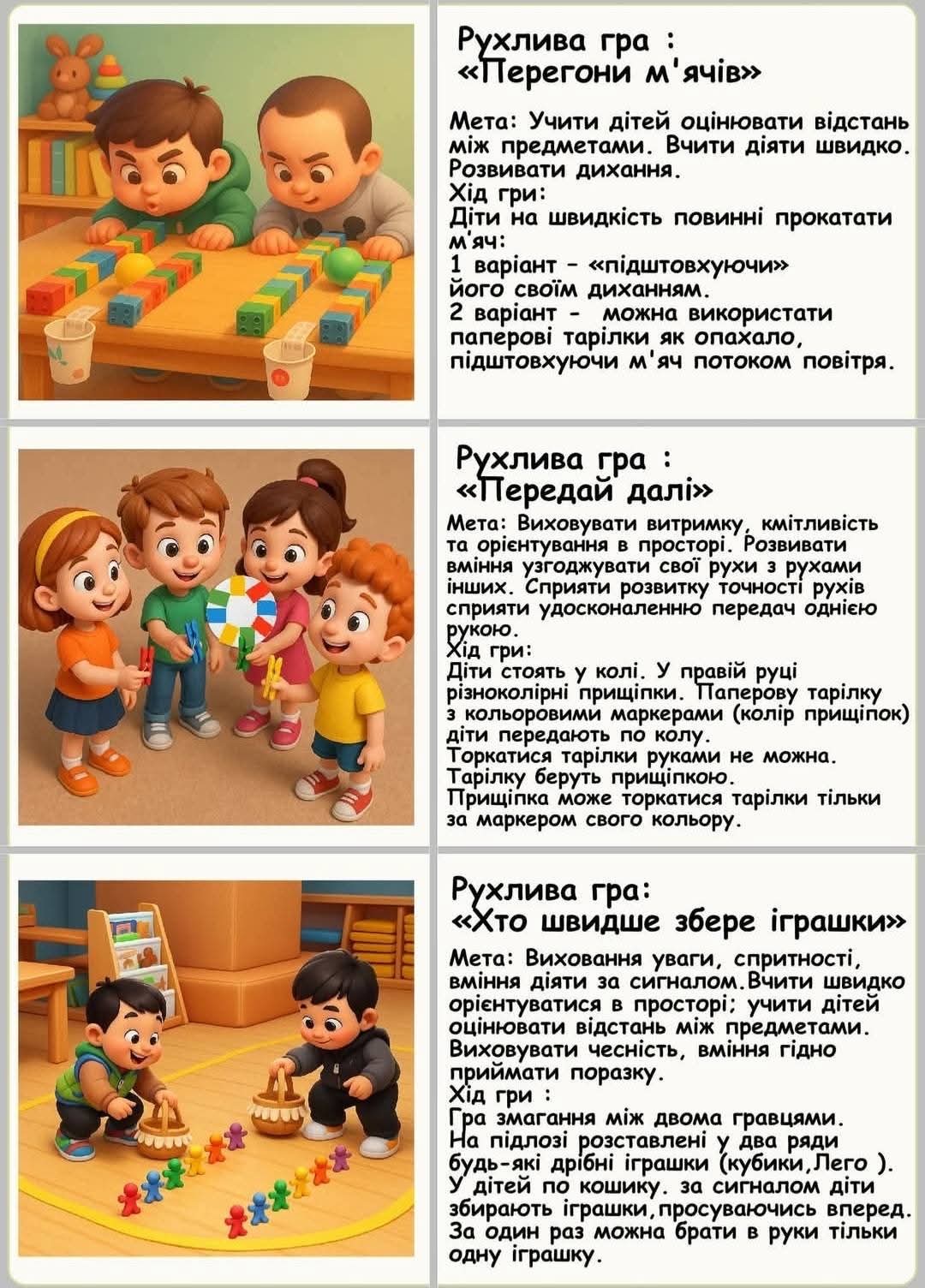 Педагоги у роботі з дітьми використовували такі обов’язкові форми роботи: заняття з фізичної культури; фізкультурно-оздоровчі заходи (ранкова гімнастика, гімнастика після денного сну, фізкультхвилинки, фізкультпаузи, гартувальні процедури); різні форми організації рухової активності у повсякденні (заняття фізичними вправами на прогулянках, фізкультурні свята й розваги, дитячий туризм, рухливі ігри, самостійна рухова активність, дні здоров’я, індивідуальна робота з фізичного виховання).